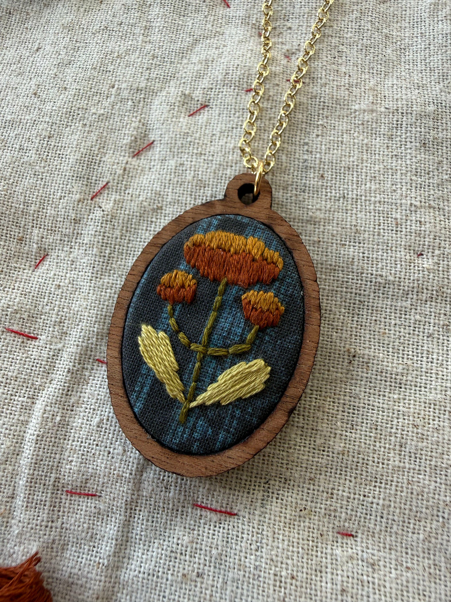 Rikrack Embroidery Folk Flowers Necklace Kit comes with everything you need to make this beautiful and unique Necklace. Perfect project for beginners and beyond. You kit comes with: 6 inch hoop, fabric, needle, Stitck and stitch water soluble design, two piece 2 inch wood charm, 24" necklace chain, instruction sheet, floss. Lots of stitcher assistance in the Stitch Guide Section