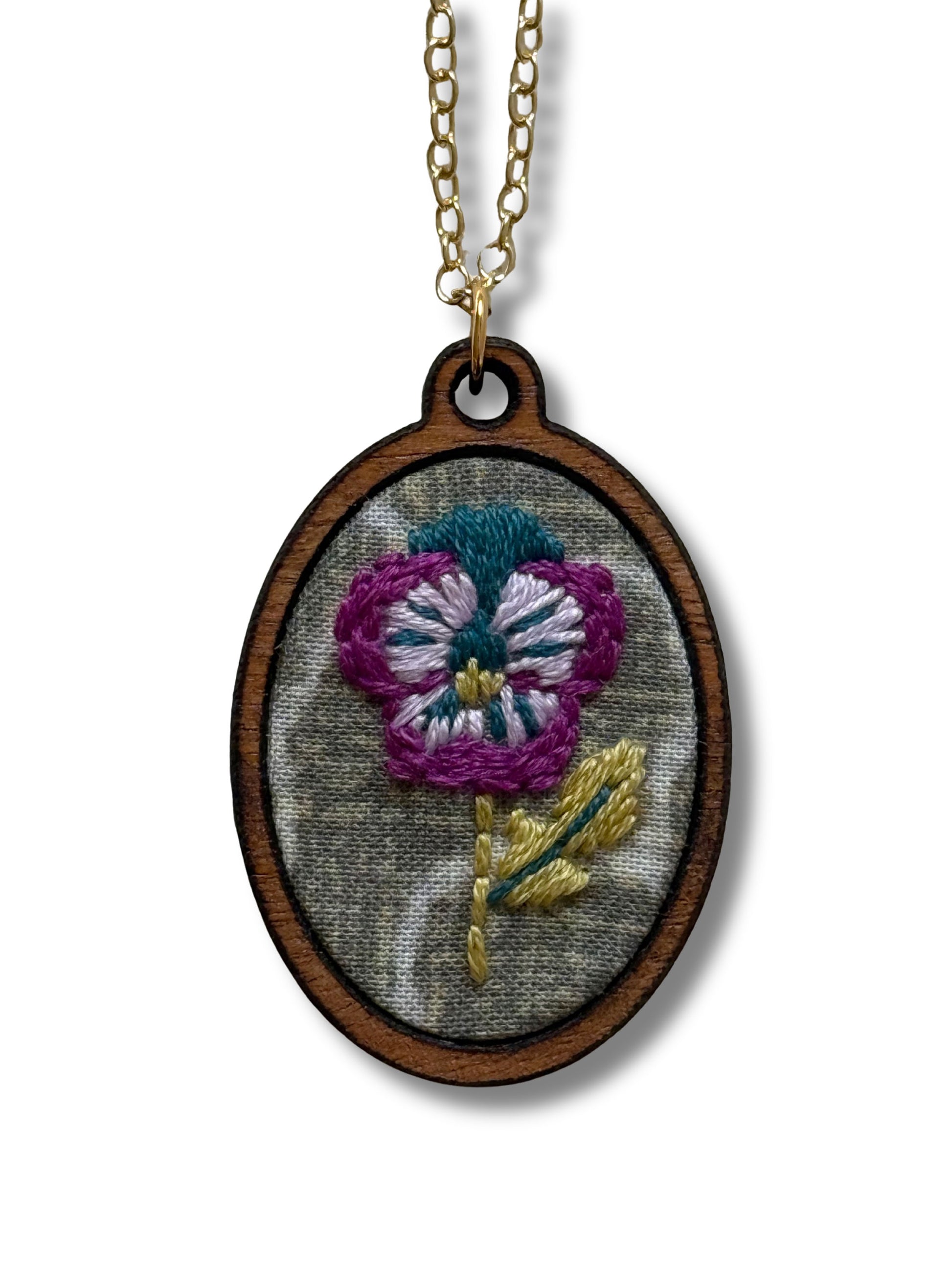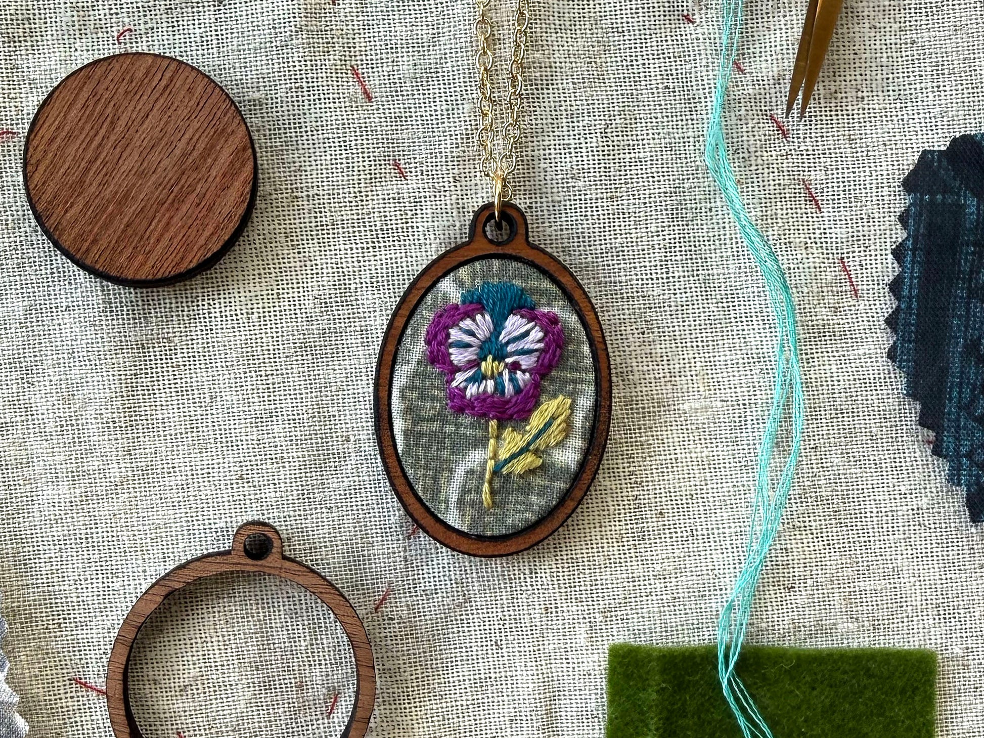 Rikrack Embroidery Purple Pansy Necklace Kit comes with everything you need to make this beautiful and unique Necklace. Perfect project for beginners and beyond. You kit comes with: 6 inch hoop, fabric, needle, Stitck and stitch water soluble design, two piece 2 inch wood charm, 24" necklace chain, instruction sheet, floss. Lots of stitcher assistance in the Stitch Guide Section.